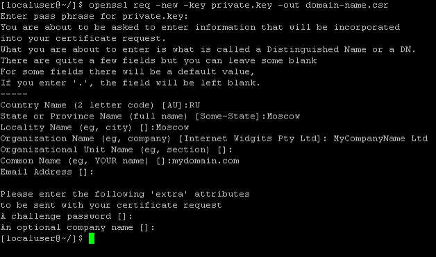 Для создания CSR введите команду: openssl req -new -key private.key -out domain-name.csr